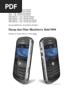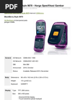 256 MB External: microSD, up to 32GB, buy memory Data 3G: EDGE: Class 10, 236.8 kbps GPRS: Class 10 (4+1/3+2 slots), 32 - 48 kbps WLAN: Wi-Fi 802.11b/g Bluetooth: v2.0 with A2DP Infrared: Cable/Port: microUSB Kamera Primer(belakang): 2 MP, 1600x1200 pixels Sekunder(depan): Video Record: QVGA Fitur Sistem Operasi(OS): BlackBerry OS CPU: 512MHz processor Browser: HTML GPS: Messaging: SMS (threaded view), MMS, Email, IM Java: Ya Radio: Baterai Stand by: Up to 408 h Talk Time: