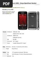 3G: HSDPA 3.6 Mbps; HSUPA EDGE: Class 10, 236.8 kbps GPRS: Class 10 (4+1/3+2 slots), 32 - 48 kbps WLAN: Ya, Wi-Fi 802.11b/g/n Bluetooth: Ya, v2.1 with A2DP Infrared: Tidak Cable/Port: Ya, microUSB v2.0 Kamera Primer(belakang): 3.15 MP, 2048x1536 pixels, autofocus, LED flash Sekunder(depan): Tidak Video Record: Ya Fitur Sistem Operasi(OS): BlackBerry OS CPU: 624 MHz processor Browser: HTML GPS: Ya, with A-GPS support Messaging: SMS, MMS, Email, Push Email, IM Java: Ya, MIDP 2.1 Radio: Tidak Baterai Stand by: Up to 432 h (2G) / Up to 312 h (3G) Talk Time: Up to 5 h 30 min (2G) / Up to 5 h (3G) Tipe: Standard battery, Li-Ion 1150 mAh Fitur Tambahan