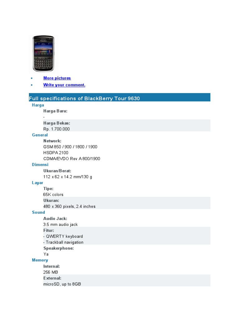Full specifications of BlackBerry Tour 9630