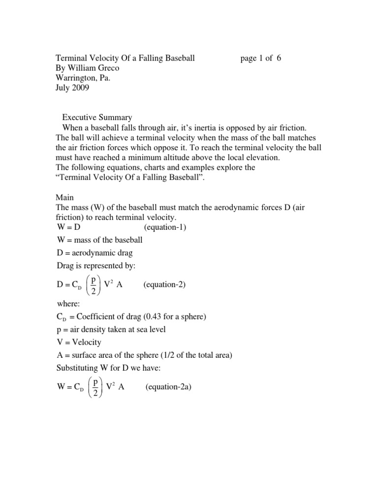 Terminal Velocity Of a Falling Baseball page 1 of 6By William GrecoWarrington, Pa.July 2009Executive SummaryWhen a baseball falls through air,