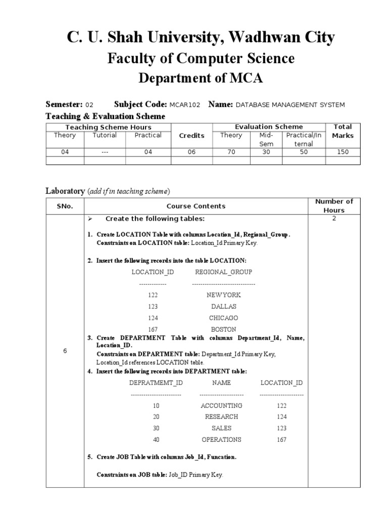SNo. Course Contents Create the following tables: Number of Hours 2