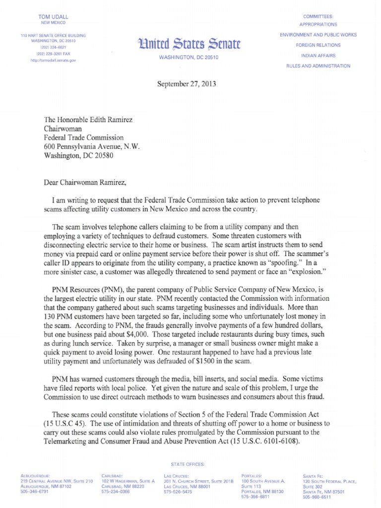 Sen. Tom Udall (D-NM) sends a letter to the Federal Communications Commission requesting action to prevent telephone scams affecting utility customers in New Mexico and across the country.