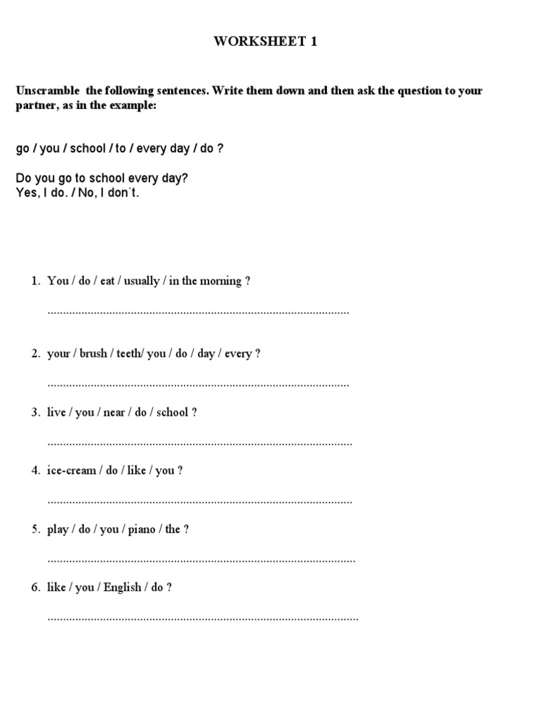 1. You / do / eat / usually / in the morning ? .................................................................................................. 2. your / brush / teeth/ you / do / day / every ? .................................................................................................. 3. live / you / near / do / school ? ................................................................................................... 4. ice-cream / do / like / you ? ................................................................................................... 5. play / do / you / piano / the ? .................................................................................................... 6. like / you / English / do ? .....................................................................................................