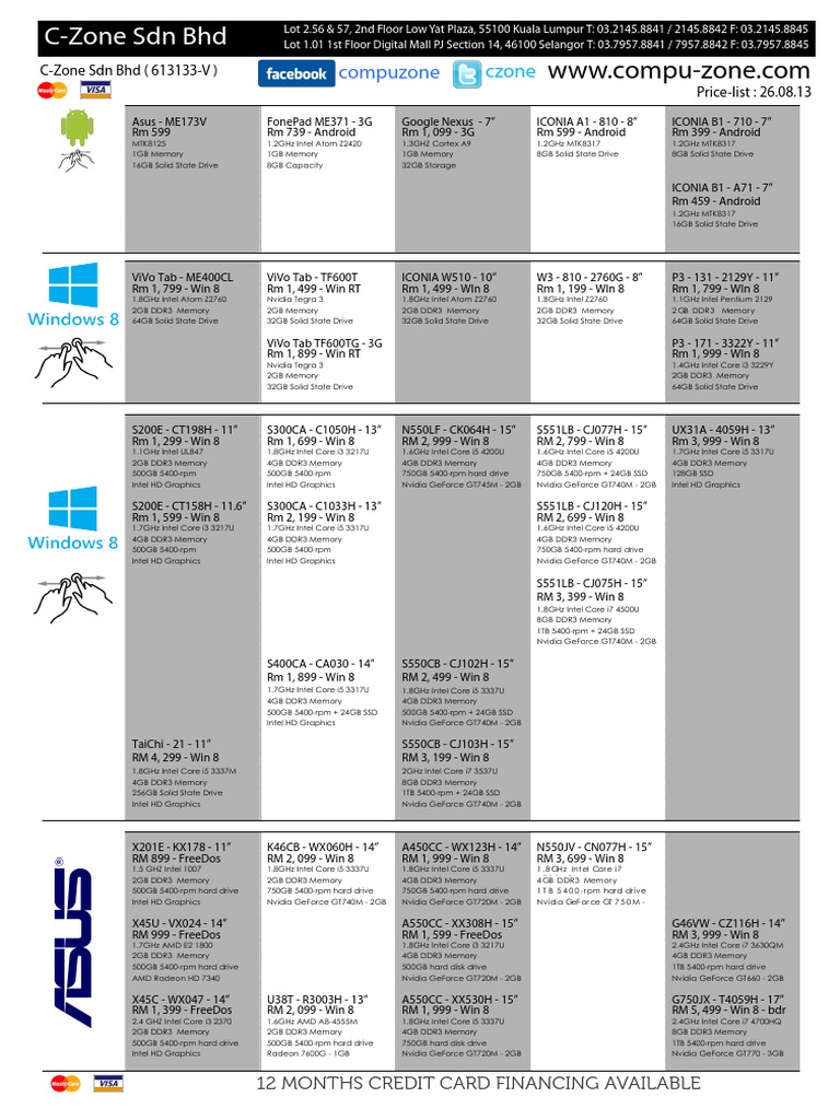 iPad 4th Gen - WiFi 16GB - Rm 1, 499 32GB - Rm 1, 799 64GB - Rm 2, 099 Z400 - 2949 - 14 RM 1, 399 - Win 8 iPad 4th Gen - WiFi 4G 16GB - Rm 1, 899 32GB - Rm 2, 199 64GB - Rm 2, 499 Z500 - 4978 - 15 RM 2, 499 - Win 8