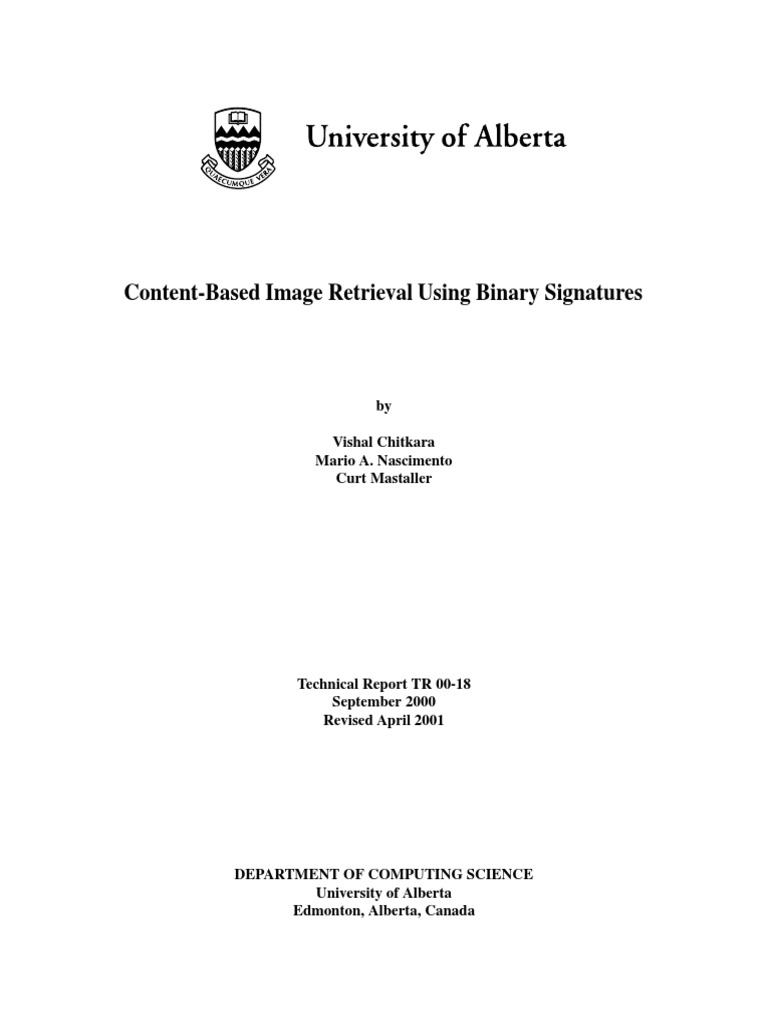 the images in the image set, and and represent the coordinate values of the feature vectors of these images respectively. Note that a smaller distance reects a closer similarity match. The above inference stems from the fact that color histograms are mapped onto points in a -dimensional space, and similar images would therefore appear relatively close to each other. This distribution of colors within an image can be further extended to capture some spatial knowledge about the color distribution of an image. A commonly used extension of the Global Color Histogram approach is its incorporation into a partition based system. The idea of Partition or Grid-based approaches is to segment the image into cells of equal or varying sizes, depending upon the implementation requirements, while using Local Color Histograms (LCHs) to represent each of these cells. A LCH is computed in the exact same way a GCH is computed, but instead of the whole image, only the cells contents are used. The Grid approach is therefore an extension of the GCH approach, since each cell is treated like an image by itself and the overall distance between two images becomes a sum of the individual Euclidean distances between corresponding LCHs. Thus, a common similarity metric used in a Grid based approach takes the following form: where all variables remain the same as dened earlier, but represents the cell number in the grid placed over the image and is the total number of cells making up the grid itself. It should be noted though, that in using either the GCH or Grid-based approach, storing -dimensional vectors of a color histogram for each image in the database may consume signicant storage space. In order to minimize the space requirement, we propose the use of a compact representation of these vectors, thereby leading us to the utilization of binary signature bit-strings. An images signature bit-string, hereafter referred to as signature, is an abstract representation of the color distribution of an image by bit-strings of a pre-determined size. The retrieval procedure assumes that the image signatures are stored sequentially in a le. To process a query, the le is scanned and all image signatures are compared against the signature of the query image using a well-dened similarity metric. The candidate images are then retrieved and ranked according to their similarity with the query image. One should note that, in order to avoid sequential scanning, the signatures need to be indexed if the image database is of a non-trivial size. An ideal index structure would then quickly lter out all irrelevant images. However, the issue of efciently indexing image signatures, as proposed in this paper, remains for further research, and is not dealt with in this paper. Our main goal is to demonstrate that the proposed signatures are an efcient and compact alternative to using GCHs. Indeed, we will argue later in the paper that the use of the proposed signatures for images may be useful for storing and searching an image database of reasonable size using a relative small amount of main memory. Hence, we might avoid, in some non-trivial cases, the need of a disk-based access structure. Nevertheless, if one aims at indexing several millions of images then a disk-based index is needed. As a matter of fact, we are currently improving a disk-based access structure for binary signatures [TNM00] in order to tackle the problem of indexing a very large number of images efciently. The effectiveness of a CBIR system ultimately depends on its ability to accurately identify the relevant images. Our basic motivation is based on the observation that classical techniques based on GCHs often offer poor performance since they treat all colors equally, and take only their distributions into account. More specically, the relative density of a color is not taken into account by these approaches. Let us motivate this point through a simple example. Consider two different pictures of a single colorful sh, with two quite different and large backgrounds. The similarities/differences among the many less dense colors of the sh are likely more important than the large difference in the background. Hence, we believe that colors relatively less dense should be given