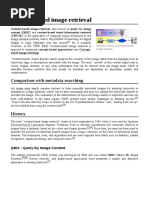 In recent years, there has been considerable research published regarding CBIR systems and techniques. In what follows, we give an overview of some representative work related to ours, i.e., color-oriented CBIR. QBIC [F 95] is a classical example of a CBIR system. It performs CBIR using several perceptual features e.g., colors and spatial-relationship. The system utilizes a partition-based approach for representing color. The retrieval using color is based on the average Munsell color and the ve most dominant colors for each of these 93]. Since the partitions, i.e., both the global and local color histograms are analyzed for image retrieval [N quadratic measure of distance is computationally intensive, the average Munsell color is used to pre-lter the candidate images. The system also denes a metric for color similarity based on the bins in the color histograms. A similarity measure based on color moments is proposed in [SO95]. The authors propose a color representation that is characterized by the rst three color moments namely color average, variance and skewness, thus yielding low space overhead. Each of these moments is part of an index structure and have the same units, which make them somewhat comparable to each other. The similarity function used for retrieval is based on the weighted sum of the absolute difference between corresponding moments of the query image and the images within the data set. A similar approach was also proposed by Appas et al [A 99], the main difference being that the image is segmented in ve overlapping cells, i.e., much like the grid-based approach discussed earlier. A superimposing 44 grid is also used in [SMM99]. Another technique for integrating color information with spatial knowledge in order to obtain an overall impression of the image is discussed in [HCP95]. The technique is based on the following steps: Heuristic rules are used to determine a set of representative colors. These colors are then used to obtain relevant spatial information using the process of maximum entropy discretization. Finally, the above computed information is utilized to retrieve the relevant similar images from the image set. The technique is based on computing the GCH and color histogram for the grid at the center. The histogram considers only those colors that contribute at least a certain percentage of the total region area. The color with the largest number of pixels in the GCH is presumed to be the background color of the image, and the color with the largest number of pixels in the central grid is presumed as being the color of the object in the image. The technique therefore addresses the problem of background distortion of an image object. A system for color indexing based on automated extraction of local regions is presented in [SC95]. The system rst denes a quantized selection of colors to be indexed. Next, a binary color set for a region is constructed based on whether the color is present for a region. In order to be captured in the index by a color set, a region must meet the following two requirements: (i) There must be at least pixels in a region, where is a user-dened parameter, and (ii) Each color in the region must contribute with at least a certain percentage of the total region 3