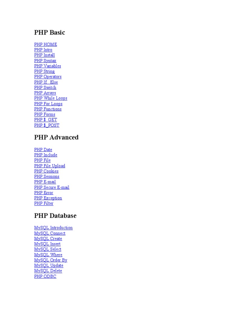 PHP Date PHP Include PHP File PHP File Upload PHP Cookies PHP Sessions PHP E-mail PHP Secure E-mail PHP Error PHP Exception PHP Filter