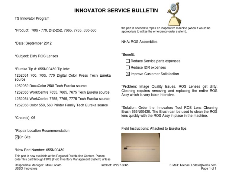 *Solution: Order the Innovators Tool ROS Lens Cleaning Brush 655N00430. The Brush can be used to clean the ROS lens quickly with the ROS Assy in place in the machine.