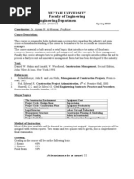 This course is designed to help students gain a perspective regarding the industry and some cross-sectional understanding of the issues to be mastered to be successful as construction managers. The course material is built around a set of topics that introduce the nature of four basic resources (money, machines, material, and manpower) and the concepts for their management. Finally, this course attempts both to pull together most of the concepts introduced this far and to present a fairly recent and innovative management form that has been developed by the industry. Text: Daniel, W. Halpin and Ronald, W. Woodhead, Construction Management, Second Edition, John Wiley & Sons, New York, 1998. References: Schaufelberger, John E. and Len Holm, Management of Construction Projects, PrenticeHall, 2002. 2. Fisk, Edward R. Construction Project Administration, 6th ed. Prentice-Hall, 2000. 3. Haswell, C.K. and De Silva D.S. Civil Engineering Contracts: Practice and Procedure, Butterworths Scientific, London, 1992. 1. Major Topics: