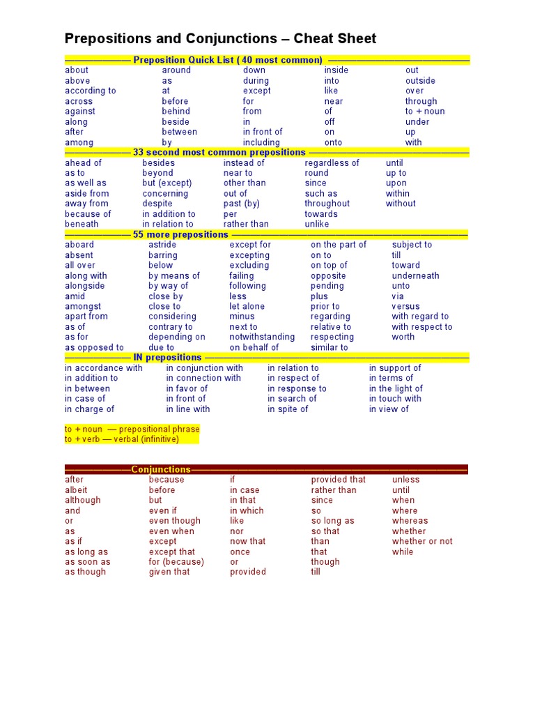 Prepositions and Conjunctions Cheat Sheet