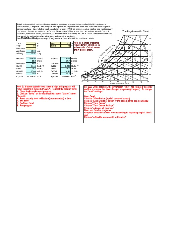 The program can replace the Psychrometric chart and users are encouraged to compare values. It permits the quick calculation of basic HVAC air mixing, cooling, heating and heat recovery processes. Thanks are extended to Dr. Jim Richardson (CE Department @ UA) and Barbara McCrary of Hattemer, Hornsby & Bailey, Pratteville, AL for assistance in learning the use of Visual Basic macros in Excel that permit the calculation of psychrometric values using functions. See HVAC Simplified (Kavanaugh, 2006) available from ASHRAE for additional details.