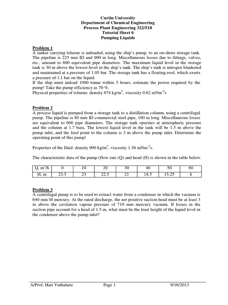 Curtin University Department of Chemical Engineering Process Plant Engineering 322/518 Tutorial Sheet 6 Pumping Liquids Problem 1 A tanker