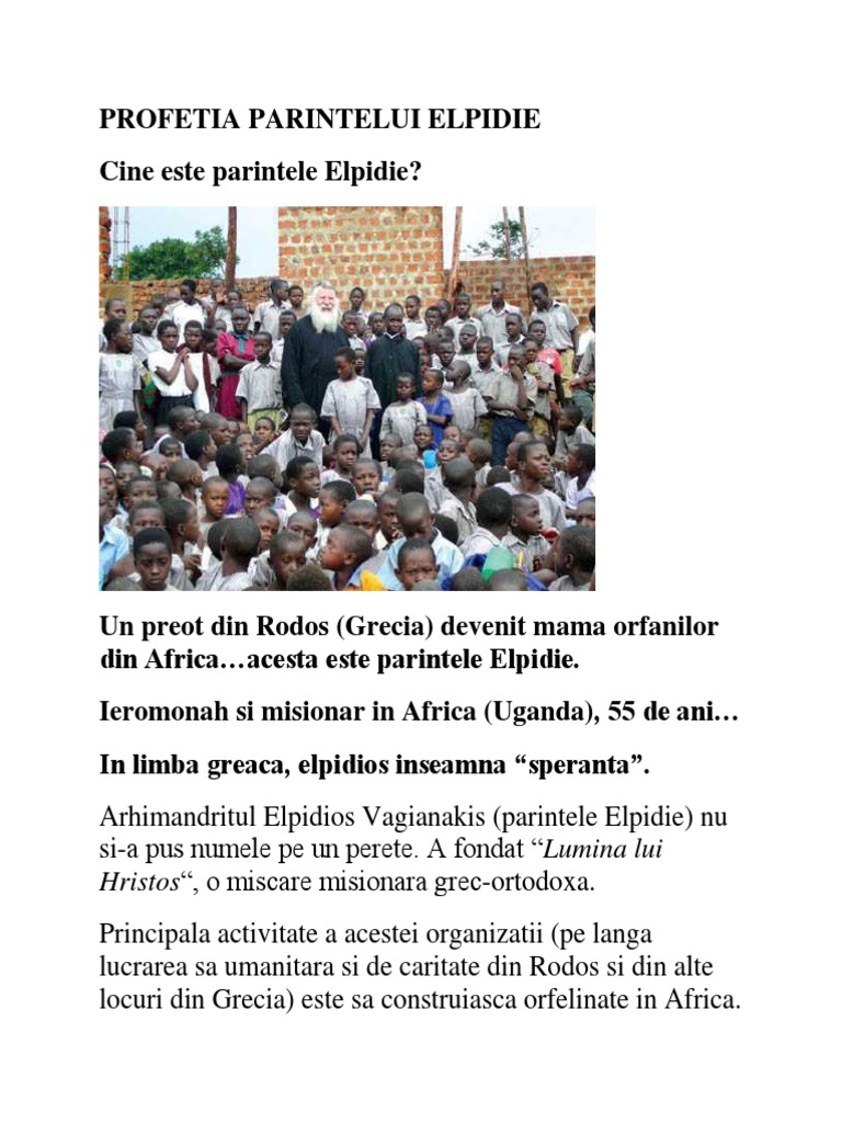 Un preot din Rodos (Grecia) devenit mama orfanilor din Africaacesta este parintele Elpidie. Ieromonah si misionar in Africa (Uganda), 55 de ani In limba greaca, elpidios inseamna speranta. Arhimandritul Elpidios Vagianakis (parintele Elpidie) nu si-a pus numele pe un perete. A fondat Lumina lui Hristos, o miscare misionara grec-ortodoxa. Principala activitate a acestei organizatii (pe langa lucrarea sa umanitara si de caritate din Rodos si din alte locuri din Grecia) este sa construiasca orfelinate in Africa.
