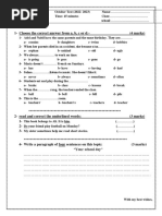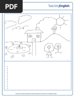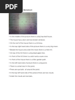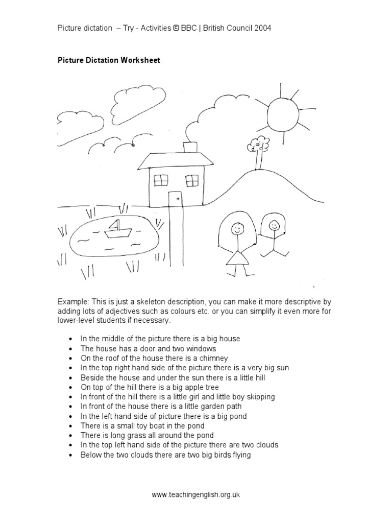 Example: This is just a skeleton description, you can make it more descriptive by adding lots of adjectives such as colours etc. or you can simplify it even more for lower-level students if necessary. In the middle of the picture there is a big house The house has a door and two windows On the roof of the house there is a chimney In the top right hand side of the picture there is a very big sun Beside the house and under the sun there is a little hill On top of the hill there is a big apple tree In front of the hill there is a little girl and little boy skipping In front of the house there is a little garden path In the left hand side of picture there is a big pond There is a small toy boat in the pond There is long grass all around the pond In the top left hand side of the picture there are two clouds Below the two clouds there are two big birds flying