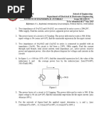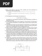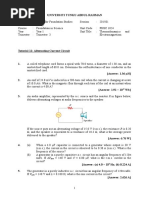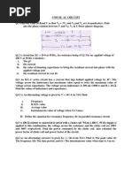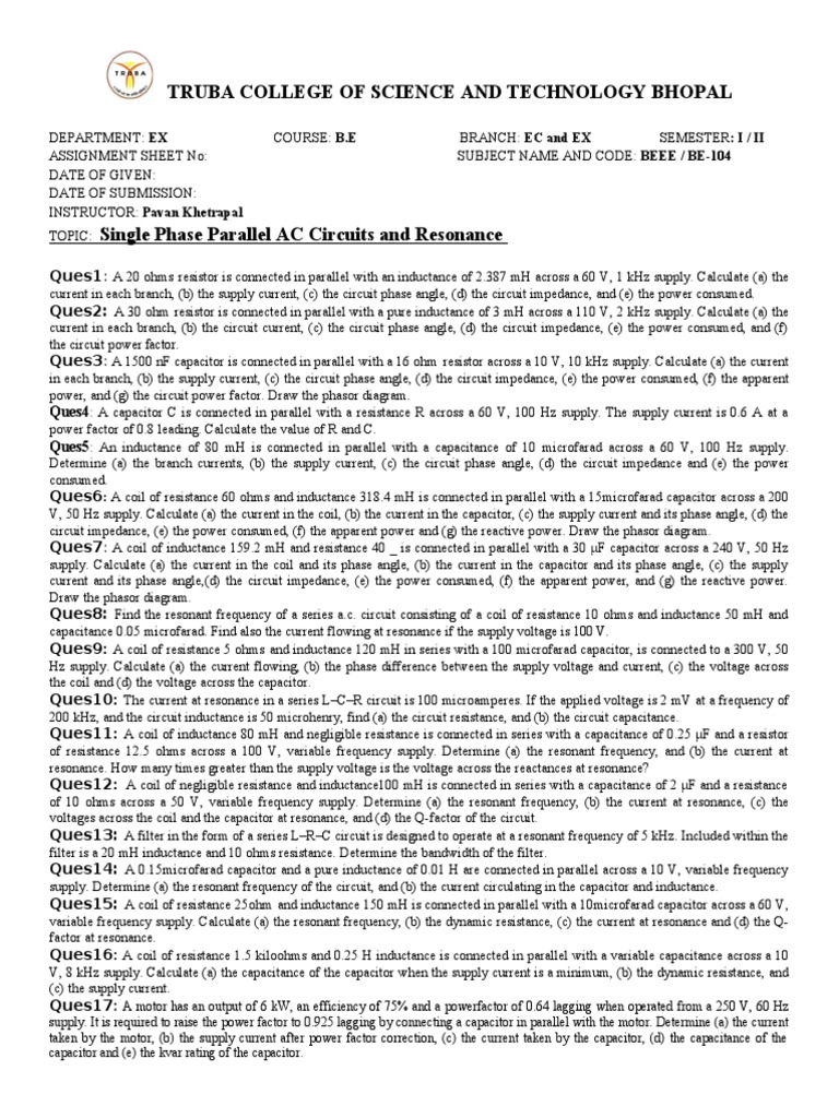 current in each branch, (b) the supply current, (c) the circuit phase angle, (d) the circuit impedance, and (e) the power consumed. Ques2: A 30 ohm resistor is connected in parallel with a pure inductance of 3 mH across a 110 V, 2 kHz supply. Calculate (a) the current in each branch, (b) the circuit current, (c) the circuit phase angle, (d) the circuit impedance, (e) the power consumed, and (f) the circuit power factor. Ques3: A 1500 nF capacitor is connected in parallel with a 16 ohm resistor across a 10 V, 10 kHz supply. Calculate (a) the current in each branch, (b) the supply current, (c) the circuit phase angle, (d) the circuit impedance, (e) the power consumed, (f) the apparent power, and (g) the circuit power factor. Draw the phasor diagram. Ques4: A capacitor C is connected in parallel with a resistance R across a 60 V, 100 Hz supply. The supply current is 0.6 A at a power factor of 0.8 leading. Calculate the value of R and C. Ques5: An inductance of 80 mH is connected in parallel with a capacitance of 10 microfarad across a 60 V, 100 Hz supply. Determine (a) the branch currents, (b) the supply current, (c) the circuit phase angle, (d) the circuit impedance and (e) the power consumed. Ques6: A coil of resistance 60 ohms and inductance 318.4 mH is connected in parallel with a 15microfarad capacitor across a 200 V, 50 Hz supply. Calculate (a) the current in the coil, (b) the current in the capacitor, (c) the supply current and its phase angle, (d) the circuit impedance, (e) the power consumed, (f) the apparent power and (g) the reactive power. Draw the phasor diagram. Ques7: A coil of inductance 159.2 mH and resistance 40 _ is connected in parallel with a 30 F capacitor across a 240 V, 50 Hz supply. Calculate (a) the current in the coil and its phase angle, (b) the current in the capacitor and its phase angle, (c) the supply current and its phase angle,(d) the circuit impedance, (e) the power consumed, (f) the apparent power, and (g) the reactive power. Draw the phasor diagram. Ques8: Find the resonant frequency of a series a.c. circuit consisting of a coil of resistance 10 ohms and inductance 50 mH and capacitance 0.05 microfarad. Find also the current flowing at resonance if the supply voltage is 100 V. Ques9: A coil of resistance 5 ohms and inductance 120 mH in series with a 100 microfarad capacitor, is connected to a 300 V, 50 Hz supply. Calculate (a) the current flowing, (b) the phase difference between the supply voltage and current, (c) the voltage across the coil and (d) the voltage across the capacitor. Ques10: The current at resonance in a series LCR circuit is 100 microamperes. If the applied voltage is 2 mV at a frequency of 200 kHz, and the circuit inductance is 50 microhenry, find (a) the circuit resistance, and (b) the circuit capacitance. Ques11: A coil of inductance 80 mH and negligible resistance is connected in series with a capacitance of 0.25 F and a resistor of resistance 12.5 ohms across a 100 V, variable frequency supply. Determine (a) the resonant frequency, and (b) the current at resonance. How many times greater than the supply voltage is the voltage across the reactances at resonance? Ques12: A coil of negligible resistance and inductance100 mH is connected in series with a capacitance of 2 F and a resistance of 10 ohms across a 50 V, variable frequency supply. Determine (a) the resonant frequency, (b) the current at resonance, (c) the voltages across the coil and the capacitor at resonance, and (d) the Q-factor of the circuit. Ques13: A filter in the form of a series LRC circuit is designed to operate at a resonant frequency of 5 kHz. Included within the filter is a 20 mH inductance and 10 ohms resistance. Determine the bandwidth of the filter. Ques14: A 0.15microfarad capacitor and a pure inductance of 0.01 H are connected in parallel across a 10 V, variable frequency supply. Determine (a) the resonant frequency of the circuit, and (b) the current circulating in the capacitor and inductance. Ques15: A coil of resistance 25ohm and inductance 150 mH is connected in parallel with a 10microfarad capacitor across a 60 V, variable frequency supply. Calculate (a) the resonant frequency, (b) the dynamic resistance, (c) the current at resonance and (d) the Qfactor at resonance. Ques16: A coil of resistance 1.5 kiloohms and 0.25 H inductance is connected in parallel with a variable capacitance across a 10 V, 8 kHz supply. Calculate (a) the capacitance of the capacitor when the supply current is a minimum, (b) the dynamic resistance, and (c) the supply current.
