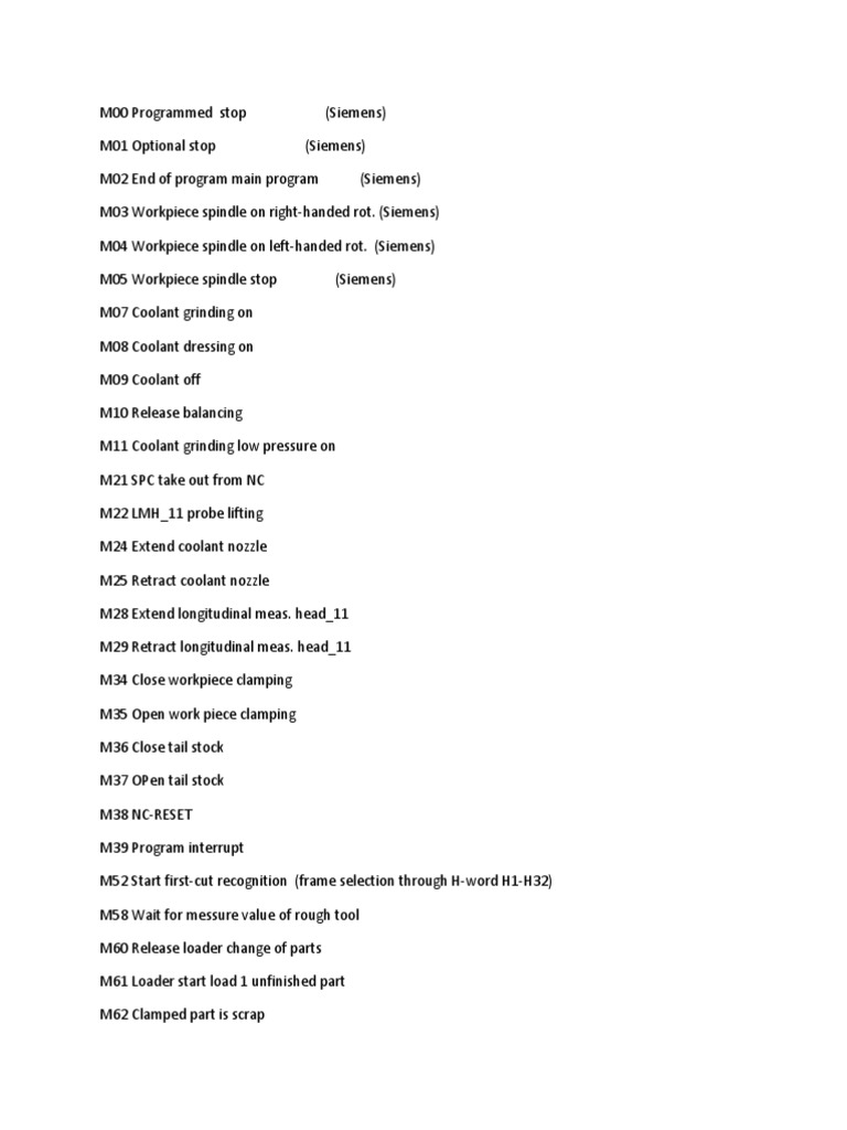 M03 Workpiece spindle on right-handed rot. (Siemens) M04 Workpiece spindle on left-handed rot. (Siemens) M05 Workpiece spindle stop M07 Coolant grinding on M08 Coolant dressing on M09 Coolant off M10 Release balancing M11 Coolant grinding low pressure on M21 SPC take out from NC M22 LMH_11 probe lifting M24 Extend coolant nozzle M25 Retract coolant nozzle M28 Extend longitudinal meas. head_11 M29 Retract longitudinal meas. head_11 M34 Close workpiece clamping M35 Open work piece clamping M36 Close tail stock M37 OPen tail stock M38 NC-RESET M39 Program interrupt M52 Start first-cut recognition (frame selection through H-word H1-H32) M58 Wait for messure value of rough tool M60 Release loader change of parts M61 Loader start load 1 unfinished part M62 Clamped part is scrap (Siemens)