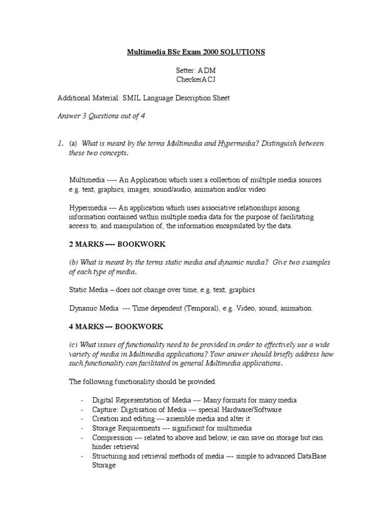 1. (a) What is meant by the terms Multimedia and Hypermedia? Distinguish between these two concepts. Multimedia ---- An Application which uses a collection of multiple media sources e.g. text, graphics, images, sound/audio, animation and/or video. Hypermedia --- An application which uses associative relationships among information contained within multiple media data for the purpose of facilitating access to, and manipulation of, the information encapsulated by the data. 2 MARKS ---- BOOKWORK (b) What is meant by the terms static media and dynamic media? Give two examples of each type of media. Static Media does not change over time, e.g. text, graphics Dynamic Media --- Time dependent (Temporal), e.g. Video, sound, animation. 4 MARKS --- BOOKWORK (c) What are the main facilities that must be provides in a system designed to support the integration of multimedia into a multimedia presentation? The following functionality should be provided: Digital Representation of Media --- Many formats for many media Capture: Digitisation of Media --- special Hardware/Software