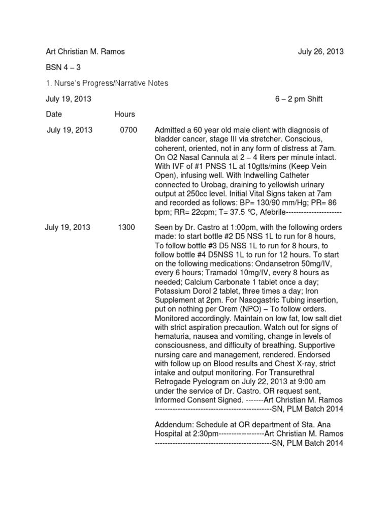 Admitted a 60 year old male client with diagnosis of bladder cancer, stage III via stretcher. Conscious, coherent, oriented, not in any form of distress at 7am. On O2 Nasal Cannula at 2 4 liters per minute intact. With IVF of #1 PNSS 1L at 10gtts/mins (Keep Vein Open), infusing well. With Indwelling Catheter connected to Urobag, draining to yellowish urinary output at 250cc level. Initial Vital Signs taken at 7am and recorded as follows: BP= 130/90 mm/Hg; PR= 86 bpm; RR= 22cpm; T= 37.5 C, Afebrile---------------------Seen by Dr. Castro at 1:00pm, with the following orders made: to start bottle #2 D5 NSS 1L to run for 8 hours, To follow bottle #3 D5 NSS 1L to run for 8 hours, to follow bottle #4 D5NSS 1L to run for 12 hours. To start on the following medications: Ondansetron 50mg/IV, every 6 hours; Tramadol 10mg/IV, every 8 hours as needed; Calcium Carbonate 1 tablet once a day; Potassium Dorol 2 tablet, three times a day; Iron Supplement at 2pm. For Nasogastric Tubing insertion, put on nothing per Orem (NPO) To follow orders. Monitored accordingly. Maintain on low fat, low salt diet with strict aspiration precaution. Watch out for signs of hematuria, nausea and vomiting, change in levels of consciousness, and difficulty of breathing. Supportive nursing care and management, rendered. Endorsed with follow up on Blood results and Chest X-ray, strict intake and output monitoring. For Transurethral Retrogade Pyelogram on July 22, 2013 at 9:00 am under the service of Dr. Castro. OR request sent, Informed Consent Signed. -------Art Christian M. Ramos ----------------------------------------------SN, PLM Batch 2014 Addendum: Schedule at OR department of Sta. Ana Hospital at 2:30pm------------------Art Christian M. Ramos ----------------------------------------------SN, PLM Batch 2014