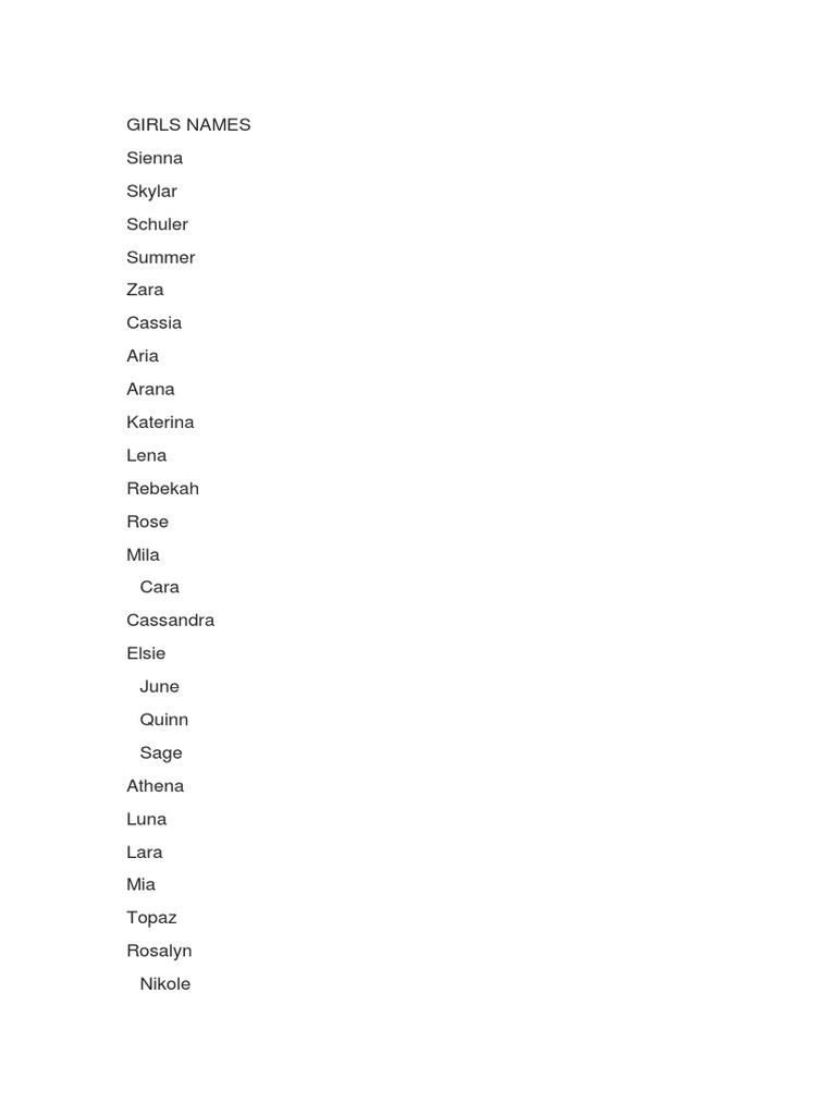 GIRLS NAMES Sienna Skylar Schuler Summer Zara Cassia Aria Arana Katerina Lena Rebekah Rose Mila