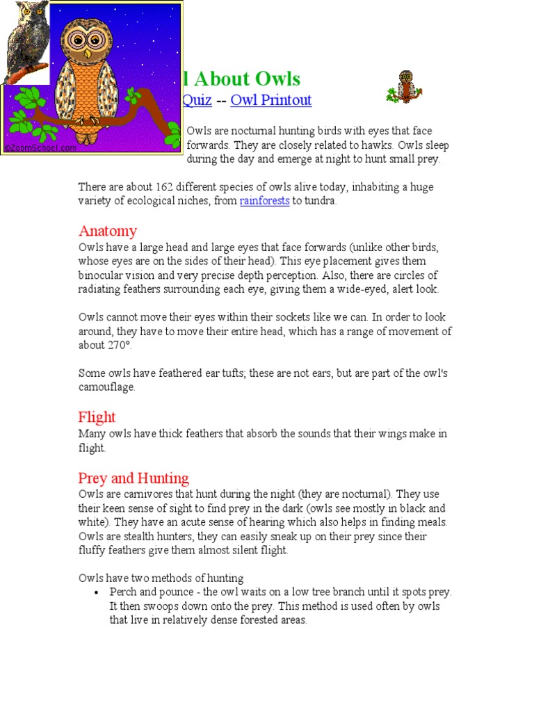 Owls are carnivores that hunt during the night (they are nocturnal). They use their keen sense of sight to find prey in the dark (owls see mostly in black and white). They have an acute sense of hearing which also helps in finding meals. Owls are stealth hunters, they can easily sneak up on their prey since their fluffy feathers give them almost silent flight. Owls have two methods of hunting Perch and pounce - the owl waits on a low tree branch until it spots prey. It then swoops down onto the prey. This method is used often by owls that live in relatively dense forested areas.