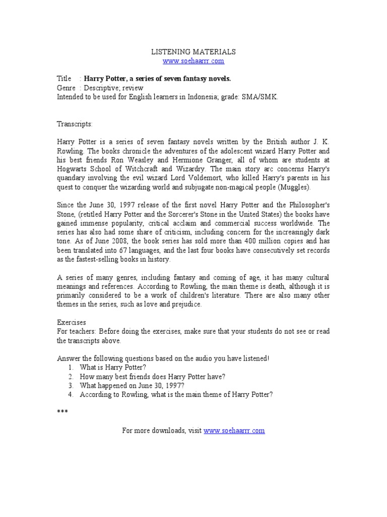 Genre : Descriptive; review Intended to be used for English learners in Indonesia; grade: SMA/SMK. Transcripts: Harry Potter is a series of seven fantasy novels written by the British author J. K. Rowling. The books chronicle the adventures of the adolescent wizard Harry Potter and his best friends Ron Weasley and Hermione Granger, all of whom are students at Hogwarts School of Witchcraft and Wizardry. The main story arc concerns Harry's quandary involving the evil wizard Lord Voldemort, who killed Harry's parents in his quest to conquer the wizarding world and subjugate non-magical people (Muggles). Since the June 30, 1997 release of the first novel Harry Potter and the Philosopher's Stone, (retitled Harry Potter and the Sorcerer's Stone in the United States) the books have gained immense popularity, critical acclaim and commercial success worldwide. The series has also had some share of criticism, including concern for the increasingly dark tone. As of June 2008, the book series has sold more than 400 million copies and has been translated into 67 languages, and the last four books have consecutively set records as the fastest-selling books in history. A series of many genres, including fantasy and coming of age, it has many cultural meanings and references. According to Rowling, the main theme is death, although it is primarily considered to be a work of children's literature. There are also many other themes in the series, such as love and prejudice. Exercises For teachers: Before doing the exercises, make sure that your students do not see or read the transcripts above. Answer the following questions based on the audio you have listened! 1. What is Harry Potter? 2. How many best friends does Harry Potter have? 3. What happened on June 30, 1997? 4. According to Rowling, what is the main theme of Harry Potter? *** For more downloads, visit www.soehaarrr.com