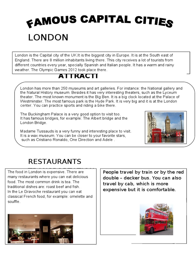 London is the Capital city of the UK.It is the biggest city in Europe. It is at the South east of England. There are 8 million inhabitants living there. This city receives a lot of tourists from different countries every year specially Spanish and Italian people. It has a !arm and rainy !eather. The "lympic #ames $%&$ too' place there.