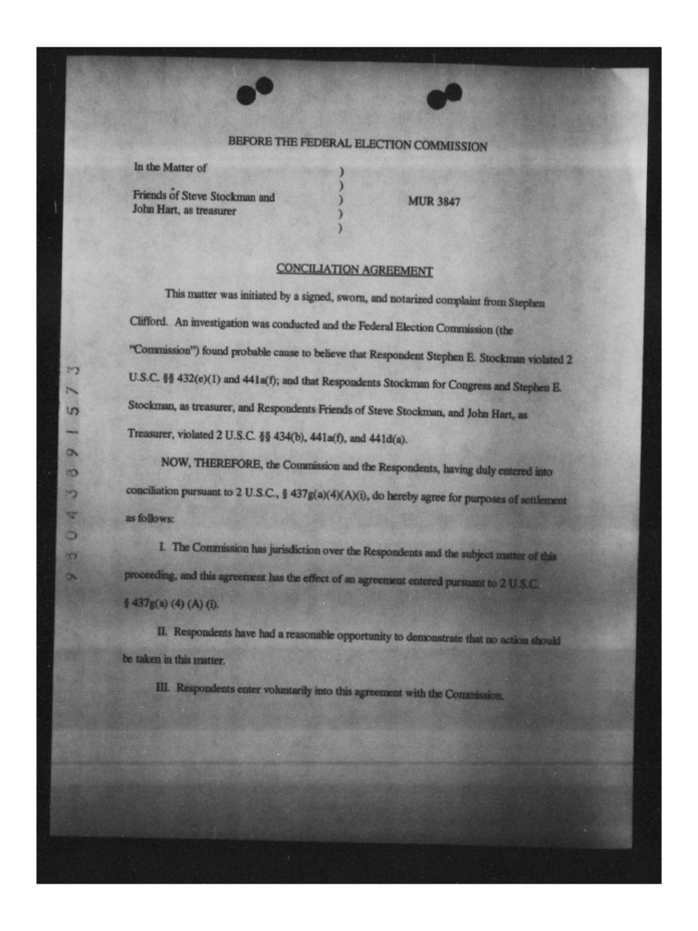 In this FEC agreement from 1998, Stockman's campaign admitted violating election laws. The violations related to inadequate disclosures about expenses the campaign allegedly made through so-called newspapers and a political consulting firm run by two Stockman staffers.
