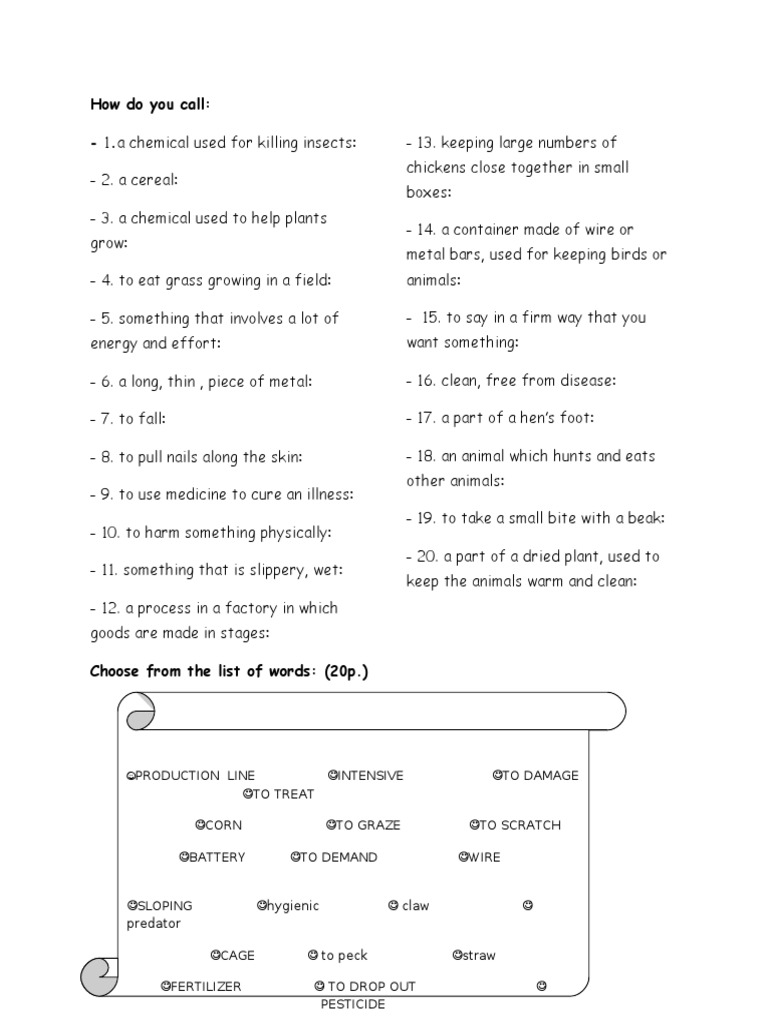 - 2. a cereal: - 3. a chemical used to help plants grow: - 4. to eat grass growing in a field: - 5. something that involves a lot of energy and effort: - 6. a long thin piece of metal: - !. to fall: - ". to pull nails along the skin: - #. to use medicine to cure an illness: - 1$. to harm something physically: - 11. something that is slippery wet: - 12. a process in a factory in which goods are made in stages: Choose from the list of words: (20p.)