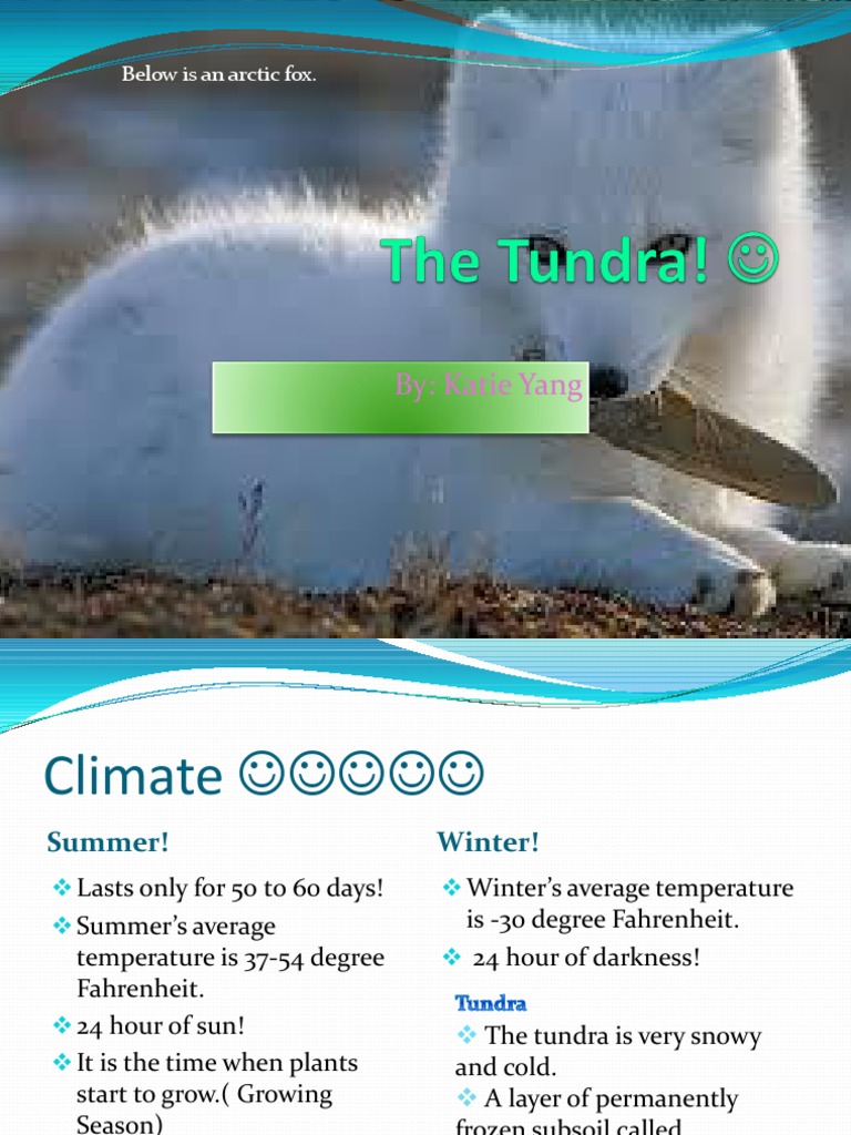 is -30 degree Fahrenheit. 24 hour of darkness! The tundra is very snowy and cold. A layer of permanently frozen subsoil called permafrost exists. Bogs and ponds are formed when it gets warmer.