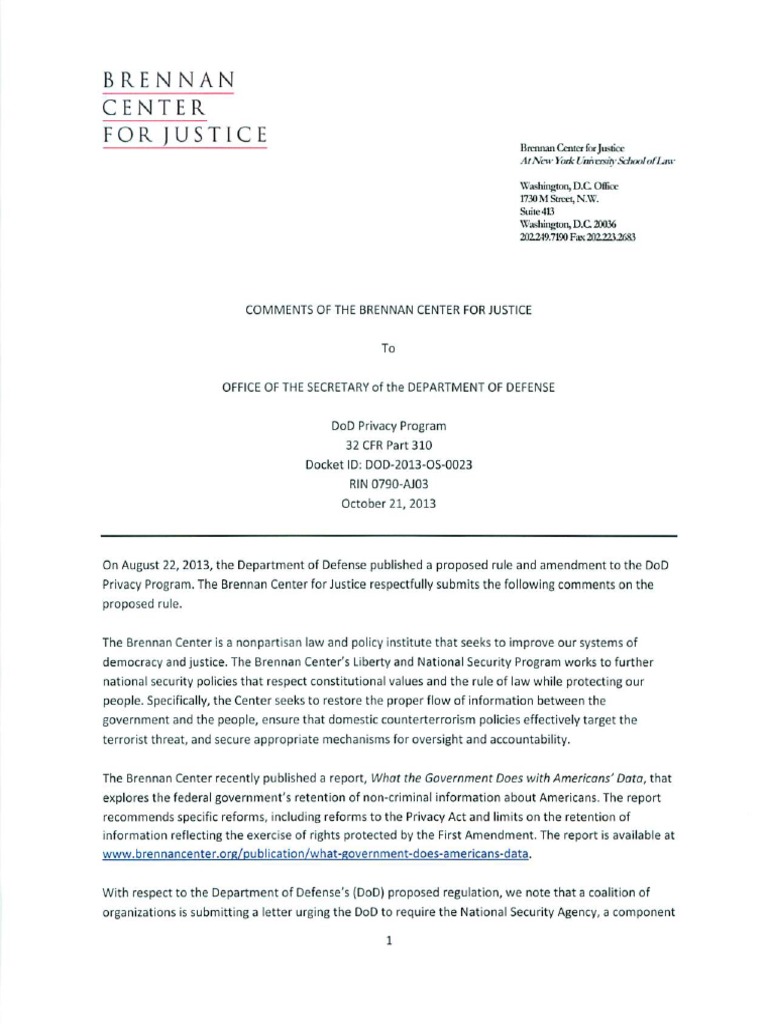 Brennan Center Comments To DoD Privacy Program Proposed Rule PDF