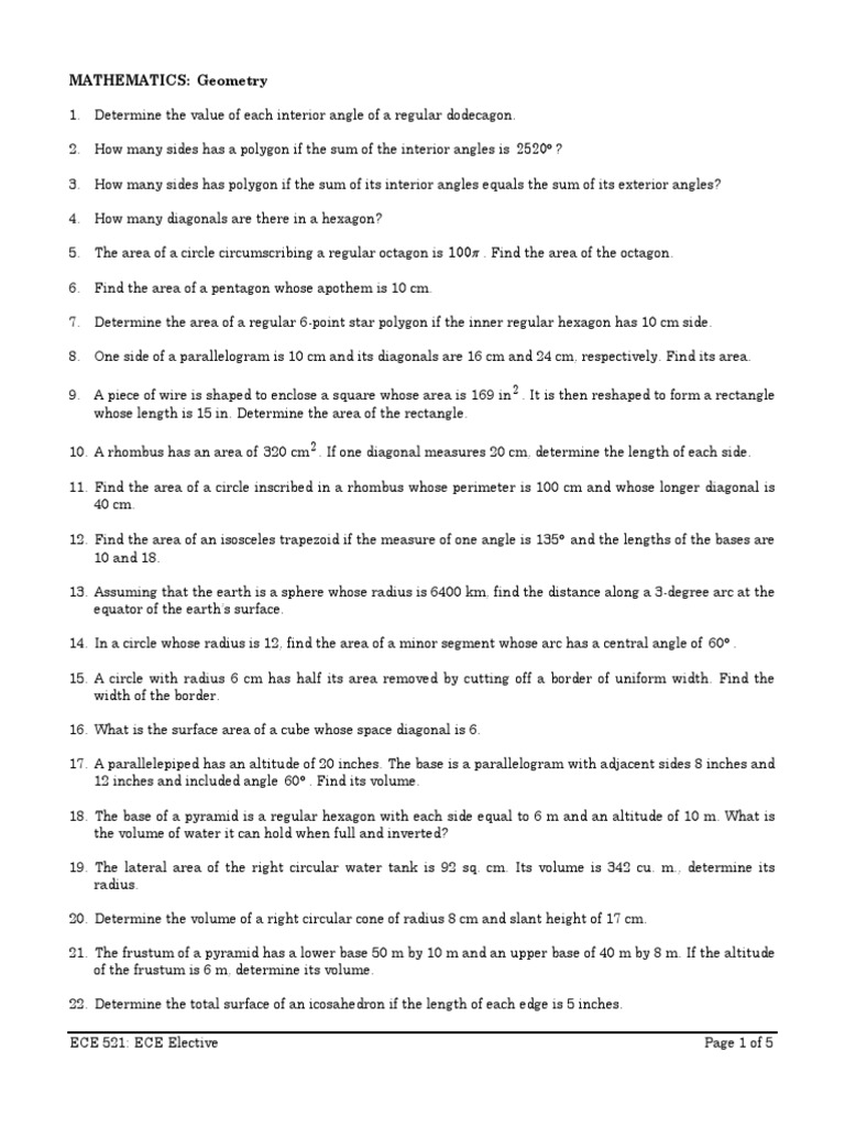 12. Find the area of an isosceles trapezoid if the measure of one angle is 135 and the lengths of the bases are 10 and 18. 13. Assuming that the earth is a sphere whose radius is 6400 km, find the distance along a 3-degree arc at the equator of the earths surface. 14. In a circle whose radius is 12, find the area of a minor segment whose arc has a central angle of 60 . 15. A circle with radius 6 cm has half its area removed by cutting off a border of uniform width. Find the width of the border. 16. What is the surface area of a cube whose space diagonal is 6. 17. A parallelepiped has an altitude of 20 inches. The base is a parallelogram with adjacent sides 8 inches and 12 inches and included angle 60 . Find its volume. 18. The base of a pyramid is a regular hexagon with each side equal to 6 m and an altitude of 10 m. What is the volume of water it can hold when full and inverted? 19. The lateral area of the right circular water tank is 92 sq. cm. Its volume is 342 cu. m., determine its radius. 20. Determine the volume of a right circular cone of radius 8 cm and slant height of 17 cm. 21. The frustum of a pyramid has a lower base 50 m by 10 m and an upper base of 40 m by 8 m. If the altitude of the frustum is 6 m, determine its volume. 22. Determine the total surface of an icosahedron if the length of each edge is 5 inches. ECE 521: ECE Elective Page 1 of 5