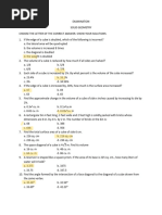 28. Water is poured to a depth of 12 cm into a hemispherical bowl of radius 20 cm. Find the volume of the water. (b) 2304 (c) 2104 (d) 2540 (a) 2210 29. The volume of a right circular cone is 36 . If its altitude is 3, find its radius. (a) 3 (b) 5 (c) 4 (d) 6 30. The volume of a regular pyramid whose base area is a regular hexagon is 156 cm3 . If the altitude of the pyramid is 5 cm, determine the length of the sides of the base. (a) 4 cm (b) 5 cm (c) 3 cm (d) 6 cm 31. For a regular polygon of heptagon sides, find the number of degrees contained in each central angle. (b) 40 (c) 60 (d) 32.73 (a) 51.43 32. The great pyramid of Egypt has a square base 232 m on a side and 147 m high. Find its volume. (b) 2,662,351 m3 (c) 2,632,242 m3 (d) 2,637,376 m3 (a) 2,768,334 m3 33. A tetrahedron is a regular solid with a equilateral triangles for each of three surfaces. If each side is 10 cm, what is the volume of the tetrahedron? (a) 116.21 cu. cm (b) 117.85 cu. m (c) 91.67 cu. m (d) 83.33 cu. m 34. A canonical vessel has a height of 24 cm and a base diameter of 12 cm. It holds water to depth of 18 cm above its vertex. Find the volume of its content in cm3 . (a) 381.7 (b) 392.2