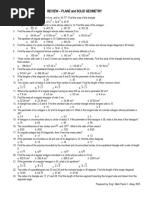 49. The bases of a right prism are a hexagon with one side 6 cm long. If the volume of the prism is 450 cm3 , how apart are the bases? (a) 4.81 cm (b) 4.22 cm (c) 5.32 cm (d) 5.06 cm 50. The circumference of the base of a right circular cylinder is 48 cm and its altitude is 15 cm. Determine its total surface area. (a) 1086.69 cm2 (b) 1042.52 cm2 (c) 1204.23 cm2 (d) 1102.62 cm2 51. A trapezoid has an area of 36 m2 and altitude of 2 m. Its two bases have ratio of 4:5. What are the lengths of the longer base? (a) 20 m (b) 30 m (c) 16 m (d) 25 m 52. The lateral area of a right circular cone is 4 times the area of the base. Find the angle at which an element of the cone is inclined to the base. (b) 7336' (c) 7531' (d) 7742' (a) 7645' 53. Three spheres of radii 10, 20 and 30 cm, respectively, are melted and formed into a single sphere. Find the surface area of the single sphere. (a) 12,645.37 cm2 54. 55. (c) 13,700.77 cm2 (d) 13,077.42 cm2 (b) 10,432.38 cm2 A sphere having a diameter of 30 cm is cut into 2 segments. The altitude of the first segment is 6 cm. What is the ratio of the area of the second segment to that of the first? (a) 2 (b) 4 (c) 3 (d) 2.5 What is the spherical excess of a spherical polygon of four sides whose angles are 95 , 112 , 134 and 78 ? (a) 60 (b) 54 (c) 67 (d) 59 Two equilateral triangles, each with 12 cm sides overlap each other to form a 6-point star. Determine the overlapping area. (b) 54 (c) 67 (d) 59 (a) 60 A reverse curve on a railroad track consists of two circular arcs. The central angle of one is 20 with radius 2500 ft and the central angle of the other is 25 with radius of 3000 ft. Find the total length of the two arcs. (a) 2182 ft (b) 2282 ft (c) 2382 ft (d) 2482 ft