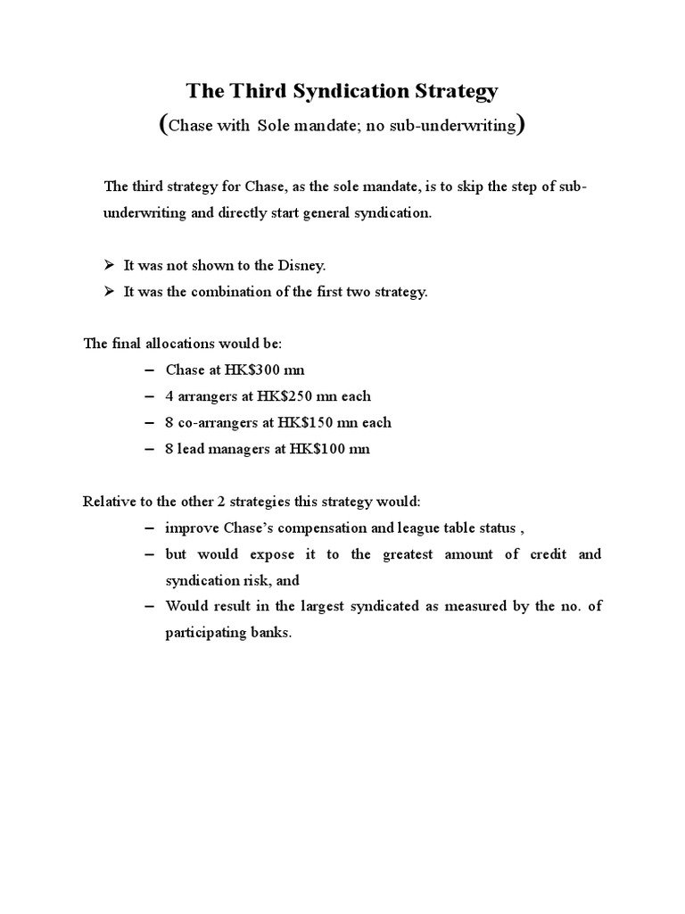 The third strategy for Chase, as the sole mandate, is to skip the step of sub underwriting and directly start general syndication. It was not shown to the Disney. It was the combination of the first two strategy. The final allocations would be: Chase at HK$300 mn 4 arrangers at HK$250 mn each 8 co-arrangers at HK$150 mn each 8 lead managers at HK$100 mn Relative to the other 2 strategies this strategy would: improve Chases compensation and league table status , but would expose it to the greatest amount of credit and syndication risk, and Would result in the largest syndicated as measured by the no. of participating banks.