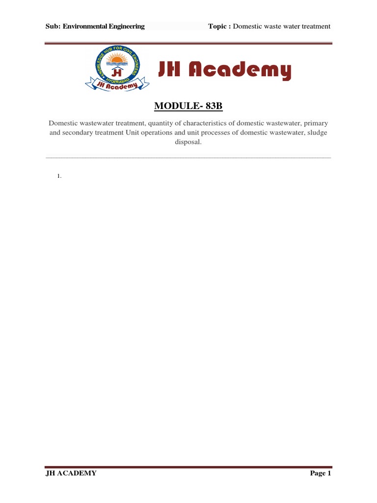Domestic wastewater treatment, quantity of characteristics of domestic wastewater, primary and secondary treatment Unit operations and unit processes of domestic wastewater, sludge disposal.