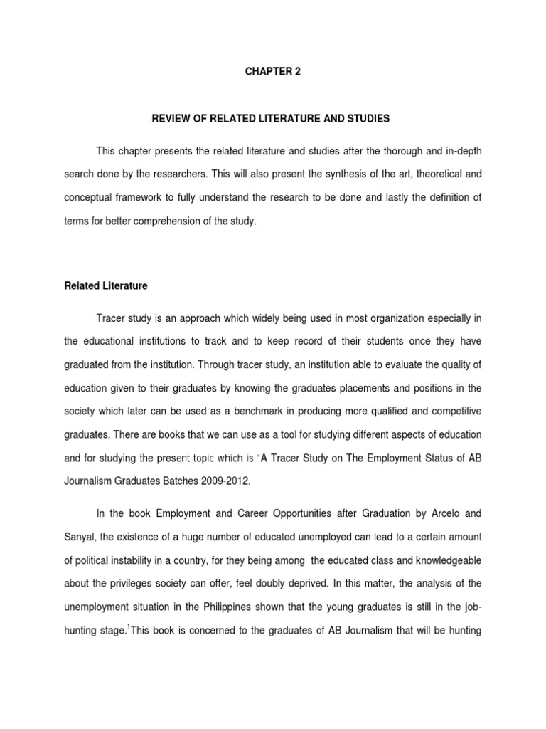 Related Literature Tracer study is an approach which widely being used in most organization especially in the educational institutions to track and to keep record of their students once they have graduated from the institution. Through tracer study, an institution able to evaluate the quality of education given to their graduates by knowing the graduates placements and positions in the society which later can be used as a benchmark in producing more qualified and competitive graduates. There are books that we can use as a tool for studying different aspects of education and for studying the present topic which is A Tracer Study on The Employment Status of AB Journalism Graduates Batches 2009-2012. In the book Employment and Career Opportunities after Graduation by Arcelo and Sanyal, the existence of a huge number of educated unemployed can lead to a certain amount of political instability in a country, for they being among the educated class and knowledgeable about the privileges society can offer, feel doubly deprived. In this matter, the analysis of the unemployment situation in the Philippines shown that the young graduates is still in the jobhunting stage.1This book is concerned to the graduates of AB Journalism that will be hunting