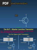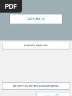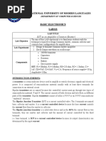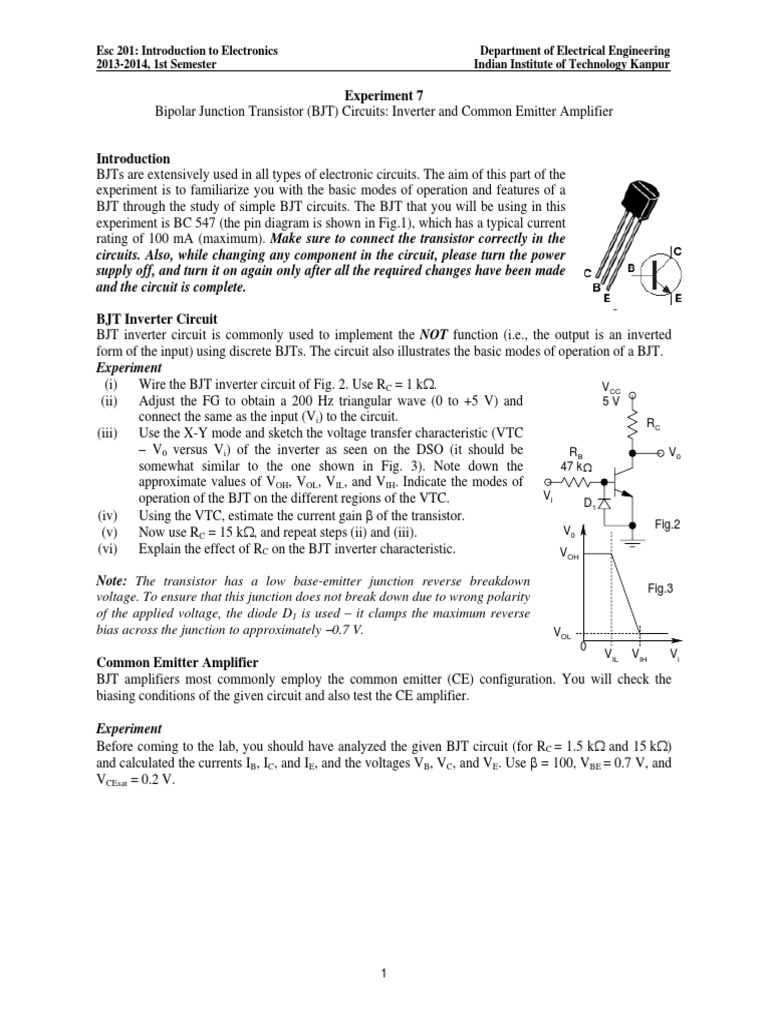 Experiment 7 Bipolar Junction Transistor (BJT) Circuits: Inverter and Common Emitter Amplifier Introduction BJTs are extensively used in all types of electronic circuits. The aim of this part of the experiment is to familiarize you with the basic modes of operation and features of a BJT through the study of simple BJT circuits. The BJT that you will be using in this experiment is BC 547 (the pin diagram is shown in Fig.1), which has a typical current rating of 100 mA (maximum). Make sure to connect the transistor correctly in the circuits. Also, while changing any component in the circuit, please turn the power supply off, and turn it on again only after all the required changes have been made and the circuit is complete. Fig.1 BJT Inverter Circuit BJT inverter circuit is commonly used to implement the NOT function (i.e., the output is an inverted form of the input) using discrete BJTs. The circuit also illustrates the basic modes of operation of a BJT. Experiment (i) Wire the BJT inverter circuit of Fig. 2. Use RC = 1 k. VCC (ii) Adjust the FG to obtain a 200 Hz triangular wave (0 to +5 V) and 5V connect the same as the input (Vi) to the circuit. RC (iii) Use the X-Y mode and sketch the voltage transfer characteristic (VTC V0 versus Vi) of the inverter as seen on the DSO (it should be RB V0 somewhat similar to the one shown in Fig. 3). Note down the 47 k approximate values of VOH, VOL, VIL, and VIH. Indicate the modes of Vi operation of the BJT on the different regions of the VTC. D1 (iv) Using the VTC, estimate the current gain of the transistor. Fig.2 V0 (v) Now use RC = 15 k, and repeat steps (ii) and (iii). (vi) Explain the effect of RC on the BJT inverter characteristic. VOH Note: The transistor has a low base-emitter junction reverse breakdown voltage. To ensure that this junction does not break down due to wrong polarity of the applied voltage, the diode D1 is used it clamps the maximum reverse bias across the junction to approximately 0.7 V.