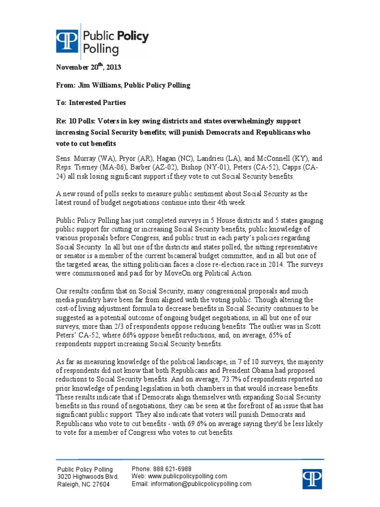 in key swing districts and states overwhelmingly support increasing Social Security benefits; will punish Democrats and Republicans who vote to cut benefits Sens. Murray (WA), Pryor (AR), Hagan (NC), Landrieu (LA), and McConnell (KY), and Reps. Tierney (MA-06), Barber (AZ-02), Bishop (NY-01), Peters (CA-52), Capps (CA24) all risk losing significant support if they vote to cut Social Security benefits. A new round of polls seeks to measure public sentiment about Social Security as the latest round of budget negotiations continue into their 4th week. Public Policy Polling has just completed surveys in 5 House districts and 5 states gauging public support for cutting or increasing Social Security benefits, public knowledge of various proposals before Congress, and public trust in each partys policies regarding Social Security. In all but one of the districts and states polled, the sitting representative or senator is a member of the current bicameral budget committee, and in all but one of the targeted areas, the sitting politician faces a close re-election race in 2014. The surveys were commissioned and paid for by [Link] Political Action. Our results confirm that on Social Security, many congressional proposals and much media punditry have been far from aligned with the voting public. Though altering the cost-of living adjustment formula to decrease benefits in Social Security continues to be suggested as a potential outcome of ongoing budget negotiations, in all but one of our surveys, more than 2/3 of respondents oppose reducing benefits. The outlier was in Scott Peters CA-52, where 66% oppose benefit reductions, and, on average, 65% of respondents support increasing Social Security benefits. As far as measuring knowledge of the political landscape, in 7 of 10 surveys, the majority of respondents did not know that both Republicans and President Obama had proposed reductions to Social Security benefits. And on average, 73.7% of respondents reported no prior knowledge of pending legislation in both chambers in that would increase benefits. These results indicate that if Democrats align themselves with expanding Social Security benefits in this round of negotiations, they can be seen at the forefront of an issue that has significant public support. They also indicate that voters will punish Democrats and Republicans who vote to cut benefits - with 69.6% on average saying they'd be less likely to vote for a member of Congress who votes to cut benefits.