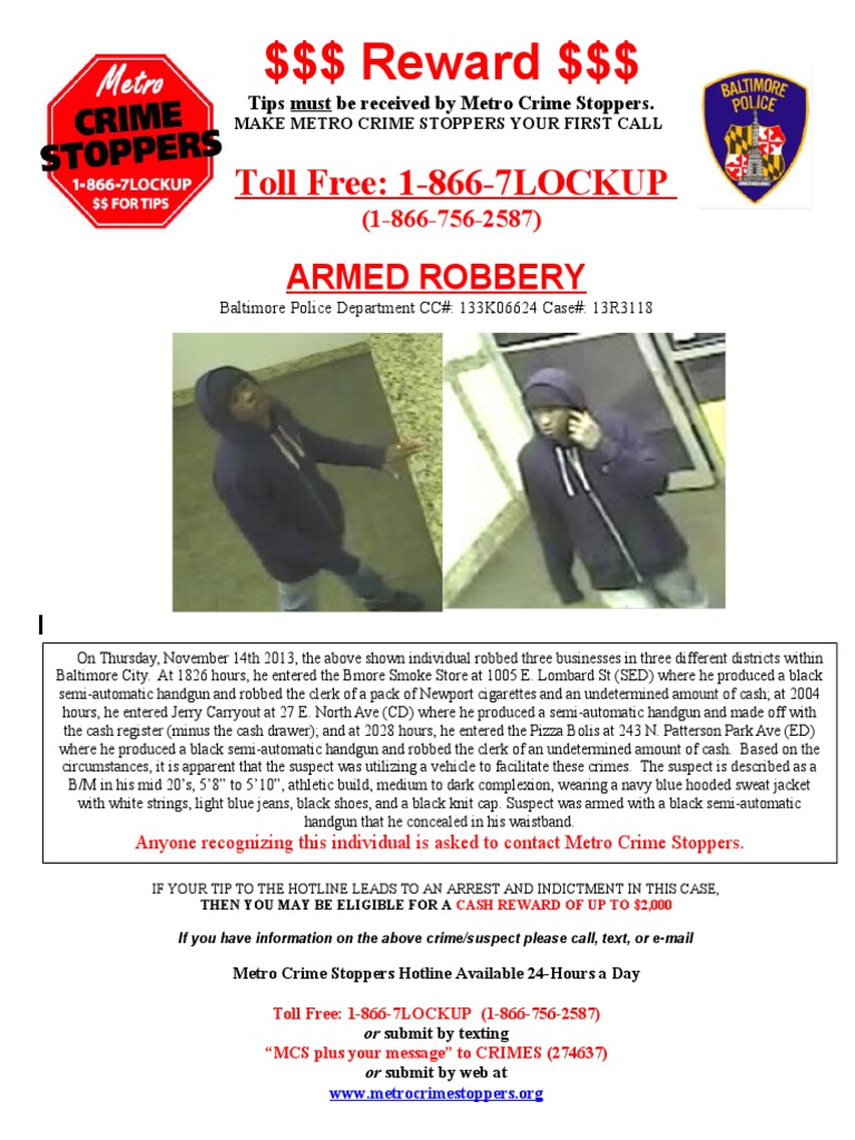 n "+,rs-a.* &o/em0er 14t+ 2013* t+e a0o/e s+o1n in-i/i-,al ro00e- t+ree 0,sinesses in t+ree -i22erent -istricts 1it+in Baltimore Cit.3 't 1826 +o,rs* +e entere- t+e Bmore (mo4e (tore at 1005 $3 %om0ar- (t 6($D7 1+ere +e pro-,ce- a 0lac4 semi8a,tomatic +an-9,n an- ro00e- t+e cler4 o2 a pac4 o2 &e1port ci9arettes an- an ,n-etermine- amo,nt o2 cas+: at 2004 +o,rs* +e entere- ;err. Carr.o,t at 2< $3 &ort+ '/e 6CD7 1+ere +e pro-,ce- a semi8a,tomatic +an-9,n an- ma-e o22 1it+ t+e cas+ re9ister 6min,s t+e cas+ -ra1er7: an- at 2028 +o,rs* +e entere- t+e Pi==a Bolis at 243 &3 Patterson Par4 '/e 6$D7 1+ere +e pro-,ce- a 0lac4 semi8a,tomatic +an-9,n an- ro00e- t+e cler4 o2 an ,n-etermine- amo,nt o2 cas+3 Base- on t+e circ,mstances* it is apparent t+at t+e s,spect 1as ,tili=in9 a /e+icle to 2acilitate t+ese crimes3 "+e s,spect is -escri0e- as a B>) in +is mi- 20?s* 5?8@ to 5?10@* at+letic 0,il-* me-i,m to -ar4 compleAion* 1earin9 a na/. 0l,e +oo-e- s1eat Bac4et 1it+ 1+ite strin9s* li9+t 0l,e Beans* 0lac4 s+oes* an- a 0lac4 4nit cap3 (,spect 1as arme- 1it+ a 0lac4 semi8a,tomatic +an-9,n t+at +e conceale- in +is 1aist0an-3