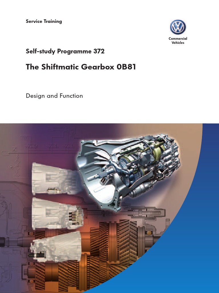 The 0B81 Shiftmatic gearbox is a 2-step gearbox with fully synchronizedgears. It has a drive shaft, a layshaft and an output shaft. All synchromeshed gears use needle bearings and are distributed on the layshaft and the output shaft. The 5th gear is selected directly by the sliding sleeve shifting to the drive shaft gear.