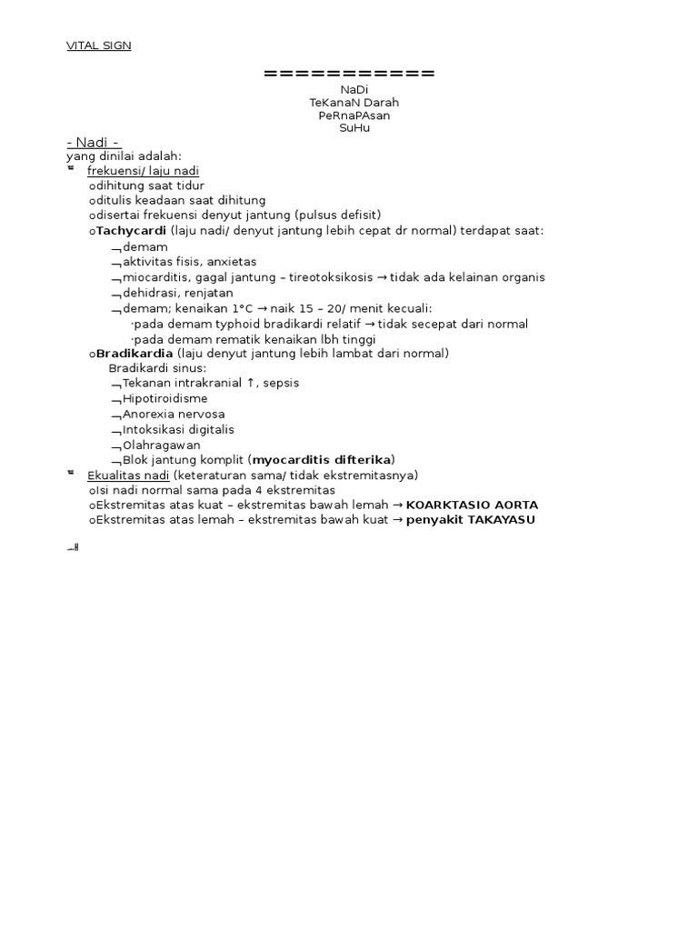 - Nadi yang dinilai adalah: frekuensi la!u nadi odihi"ung saa" "idur odi"ulis keadaan saa" dihi"ung odiser"ai frekuensi denyu" !an"ung #$ulsus defisi"% oTachycardi #la!u nadi denyu" !an"ung le&ih 'e$a" dr n(r)al% "erda$a" saa": de)a) ak"i*i"as fisis+ an,ie"as )i('ardi"is+ gagal !an"ung - "ire("(ksik(sis . "idak ada kelainan (rganis dehidrasi+ ren!a"an de)a)/ kenaikan 012 . naik 03 - 45 )eni" ke'uali: 6$ada de)a) "y$h(id &radikardi rela"if . "idak se'e$a" dari n(r)al 6$ada de)a) re)a"ik kenaikan l&h "inggi oBradikardia #la!u denyu" !an"ung le&ih la)&a" dari n(r)al% 7radikardi sinus: Tekanan in"rakranial 8+ se$sis Hi$("ir(idis)e An(re,ia ner*(sa In"(ksikasi digi"alis 9lahraga:an 7l(k !an"ung k()$li" #myocarditis difterika% ;kuali"as nadi #ke"era"uran sa)a "idak eks"re)i"asnya% oIsi nadi n(r)al sa)a $ada < eks"re)i"as o;ks"re)i"as a"as kua" - eks"re)i"as &a:ah le)ah . KOARKTASIO AORTA o;ks"re)i"as a"as le)ah - eks"re)i"as &a:ah kua" . penyakit TAKAYASU