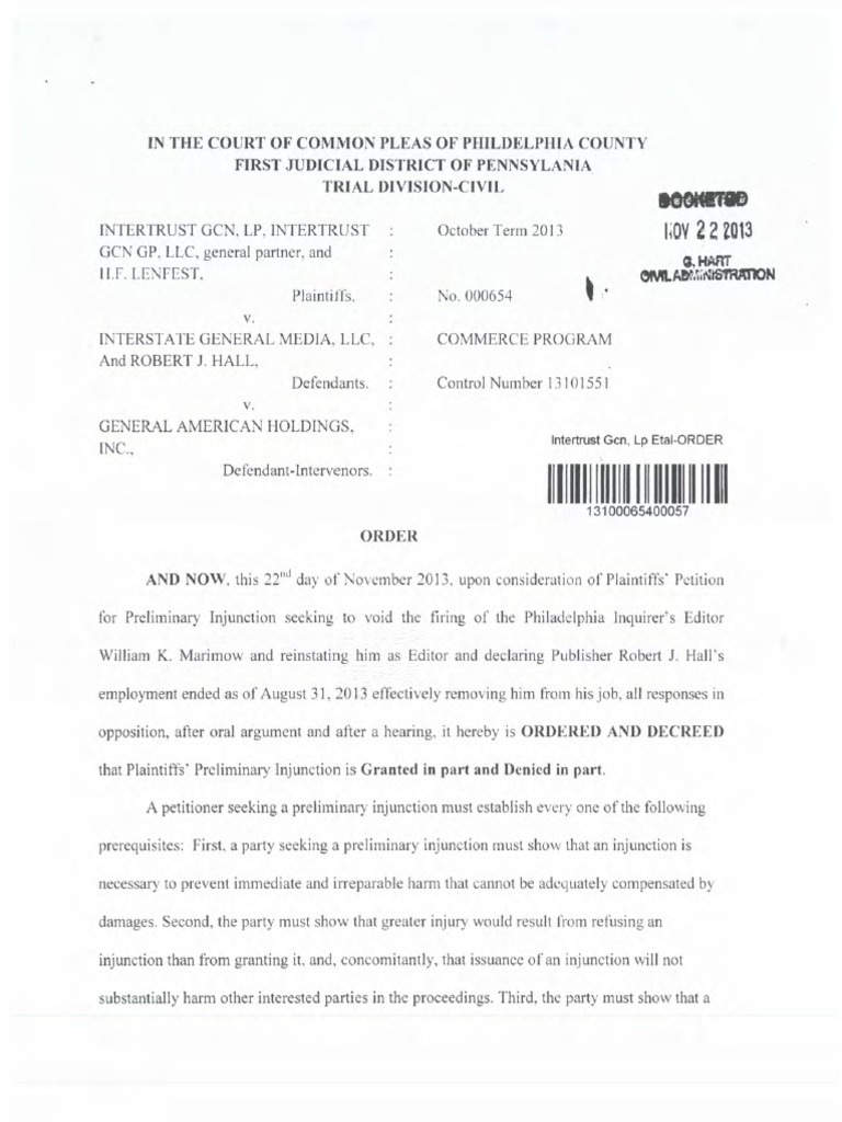 Ruling by Judge Patricia A. McInerney ordering the Inquirer to reinstate Bill Marimow as editor, effective immediately.