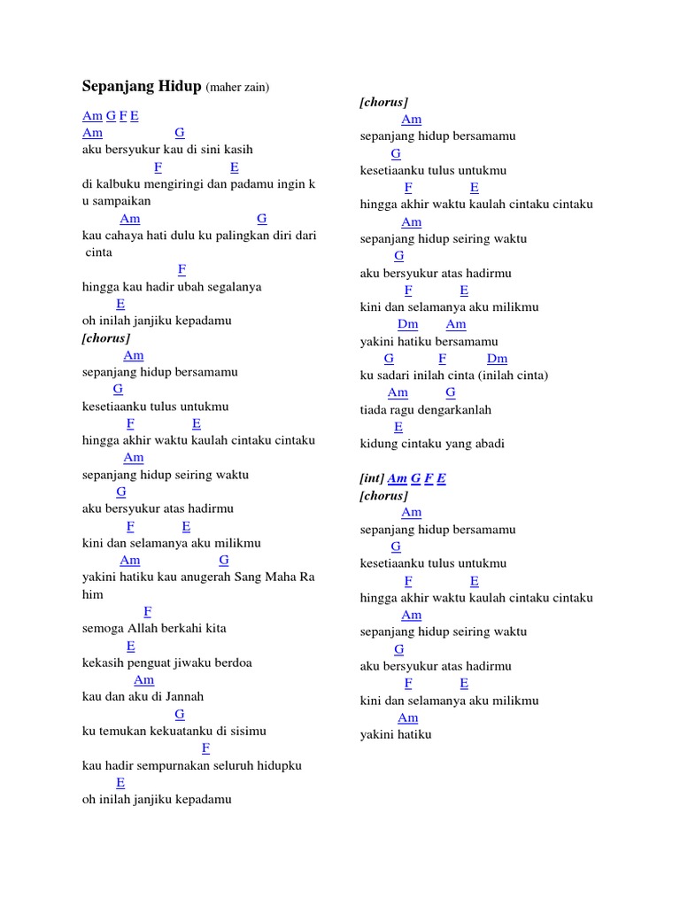 Am G F E Am G aku bersyukur kau di sini kasih F E di kalbuku mengiringi dan padamu ingin k u sampaikan Am G kau cahaya hati dulu ku palingkan diri dari cinta F hingga kau hadir ubah segalanya E oh inilah janjiku kepadamu [chorus] Am sepanjang hidup bersamamu G kesetiaanku tulus untukmu F E hingga akhir waktu kaulah cintaku cintaku Am sepanjang hidup seiring waktu G aku bersyukur atas hadirmu F E kini dan selamanya aku milikmu Am G yakini hatiku kau anugerah Sang Maha Ra him F semoga Allah berkahi kita E kekasih penguat jiwaku berdoa Am kau dan aku di Jannah G ku temukan kekuatanku di sisimu F kau hadir sempurnakan seluruh hidupku E oh inilah janjiku kepadamu [chorus] Am sepanjang hidup bersamamu G kesetiaanku tulus untukmu F E hingga akhir waktu kaulah cintaku cintaku Am sepanjang hidup seiring waktu G aku bersyukur atas hadirmu F E kini dan selamanya aku milikmu Dm Am yakini hatiku bersamamu G F Dm ku sadari inilah cinta (inilah cinta) Am G tiada ragu dengarkanlah E kidung cintaku yang abadi [int] Am G F E [chorus] Am sepanjang hidup bersamamu G kesetiaanku tulus untukmu F E hingga akhir waktu kaulah cintaku cintaku Am sepanjang hidup seiring waktu G aku bersyukur atas hadirmu F E kini dan selamanya aku milikmu Am yakini hatiku