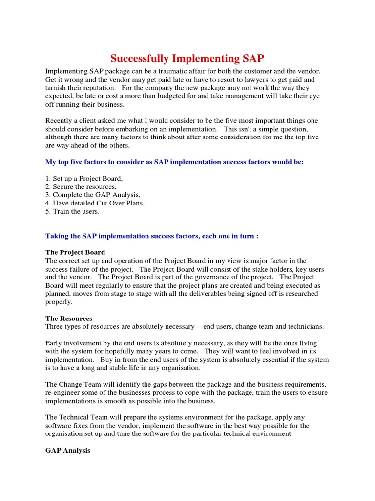 Taking the SAP implementation success factors, each one in turn : The Project Board The correct set up and operation of the Project Board in my view is major factor in the success failure of the project. The Project Board will consist of the stake holders, key users and the vendor. The Project Board is part of the governance of the project. The Project Board will meet regularly to ensure that the project plans are created and being executed as planned, moves from stage to stage with all the deliverables being signed off is researched properly. The Resources Three types of resources are absolutely necessary -- end users, change team and technicians. Early involvement by the end users is absolutely necessary, as they will be the ones living with the system for hopefully many years to come. They will want to feel involved in its implementation. Buy in from the end users of the system is absolutely essential if the system is to have a long and stable life in any organisation. The Change Team will identify the gaps between the package and the business requirements, re-engineer some of the businesses process to cope with the package, train the users to ensure implementations is smooth as possible into the business. The Technical Team will prepare the systems environment for the package, apply any software fixes from the vendor, implement the software in the best way possible for the organisation set up and tune the software for the particular technical environment. GAP Analysis
