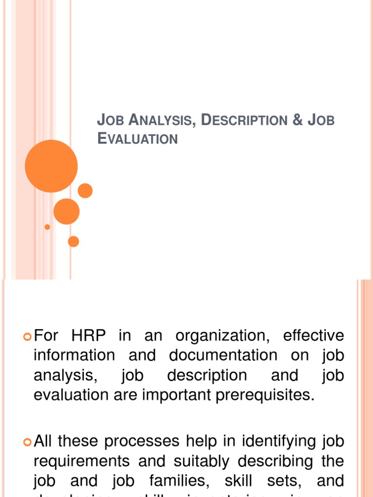 HRP in an organization, effective information and documentation on job analysis, job description and job evaluation are important prerequisites. these processes help in identifying job requirements and suitably describing the job and job families, skill sets, and developing skill inventories in an organization.
