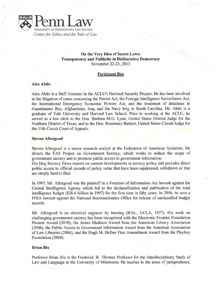 Listed: 34 bios for Penn's conference "On the Very Idea of Secret Laws", detailing various members of academia, the Intelligence Community, and the defense industry.