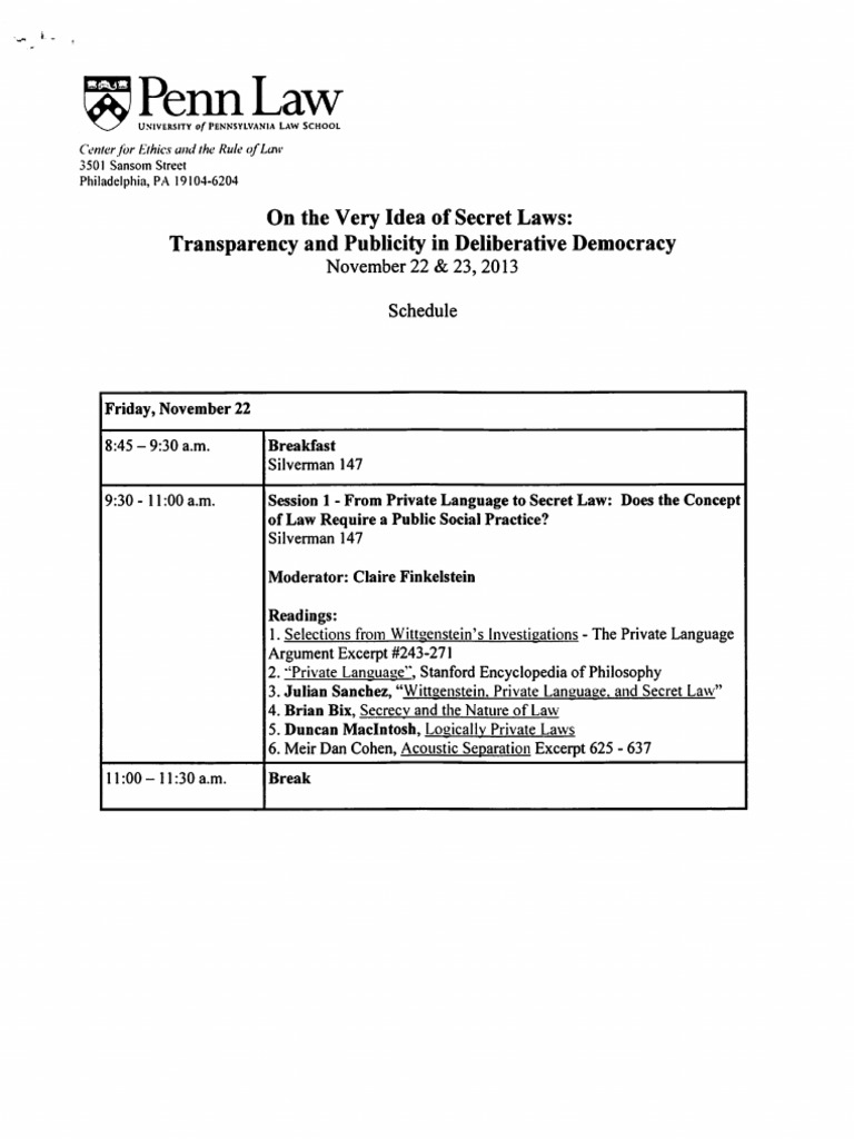 Four page description of Penn's "On the Very Idea of Secret Laws" schedule 22 November 2013 - 23 November 2013), in chronological order: