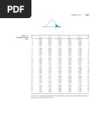 This document contains critical values for the t-distribution based on degrees of freedom. It provides t-values for various confidence levels (100%, 50%, 25%, 10%, 5%) across different degrees of freedom ranging from 1 to infinity. The t-distribution is used to test if a sample mean differs significantly from a hypothesized population mean. This table allows researchers to compare a calculated t-statistic to pre-determined critical values to determine statistical significance.