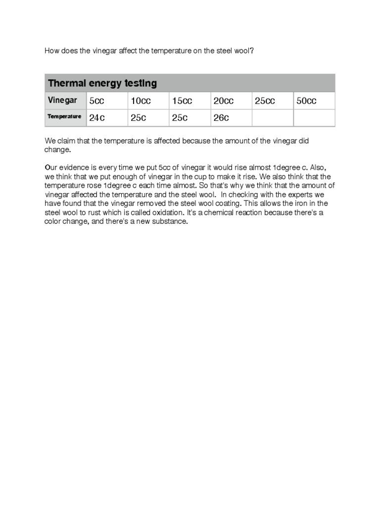 We claim that the temperature is affected because the amount of the vinegar did change. ! Our evidence is every time we put 5cc of vinegar it would rise almost 1degree c. Also, we think that we put enough of vinegar in the cup to make it rise. We also think that the temperature rose 1degree c each time almost. So that's why we think that the amount of vinegar affected the temperature and the steel wool. In checking with the experts we have found that the vinegar removed the steel wool coating. This allows the iron in the steel wool to rust which is called oxidation. It's a chemical reaction because there's a color change, and there's a new substance.