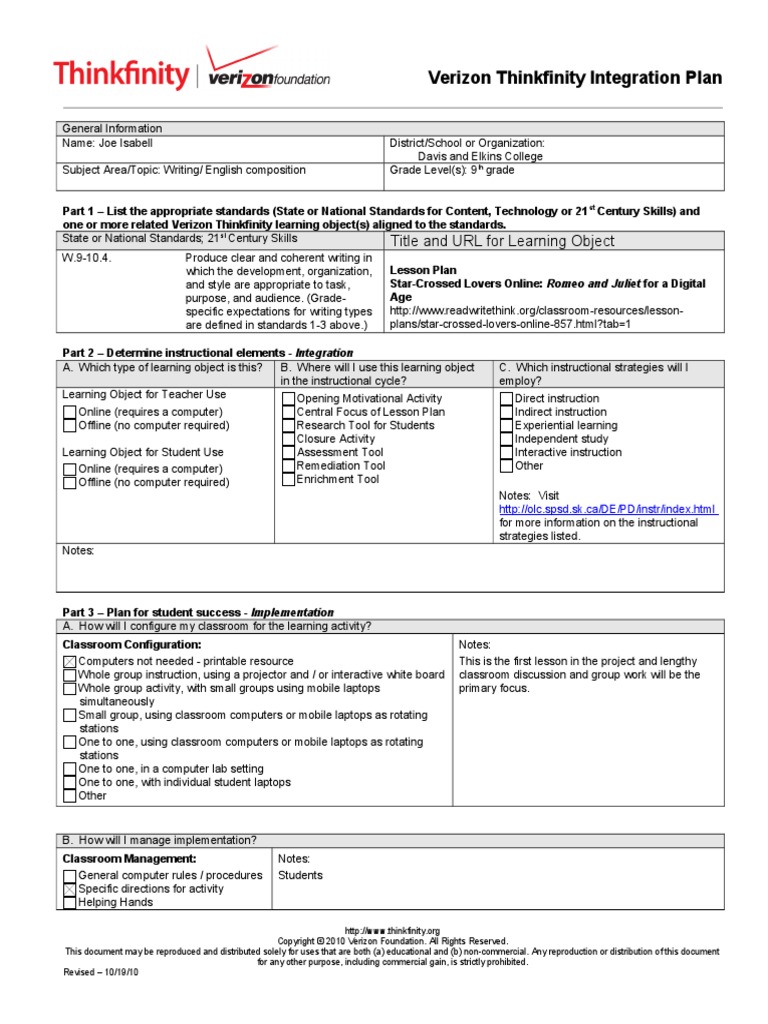 Verizon Thinkfinity Integration Plan